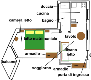 L'appartamento è situato in via Gabriello Chiabrera 39 interno 3 (1° piano) e dista dalla fermata San Paolo della metropolitana meno di 300 metri (vedi cartina stradale e mappa satellitare). L'interno è stato recentemente completamente ristrutturato e in questa circostanza grande attenzione è stata posta nella scelta dei materiali e dell'arredamento al fine di ottenere un ambiente caldo e confortevole. Il locale ha una superficie di circa 40 metri quadrati ed è composto da una camera con letto matrimoniale e guardaroba, un salottino con divano letto e guardaroba, una cucina completamente equipaggiata e un bagno dotato di doccia. Un piccolo balcone si affaccia, inoltre, su un giardino condominiale disposto lateralmente alla via Chiabrera. La tranquillità è garantita sia dal fatto che via Chiabrera è una strada locale e quindi non interessata dalle forti correnti di traffico che caratterizzano altre parti della città, sia perché l'appartamento non è situato direttamente sulla via. |